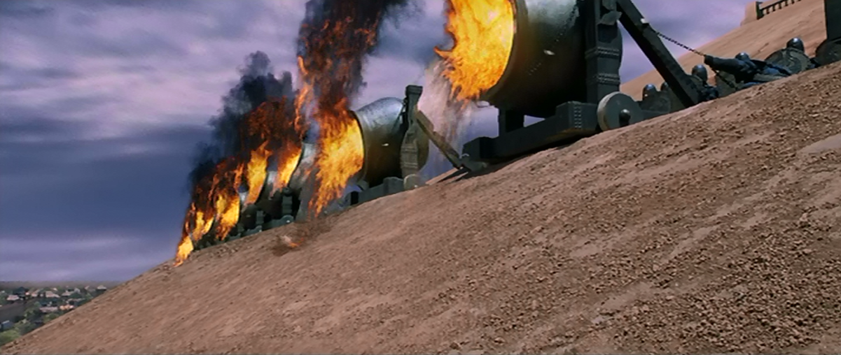And the battle scenes are absolutely epic. Here a castle is being defended by cauldrons of oil which are lit on fire and then poured down the sloping walls of the castle to consume the invaders.