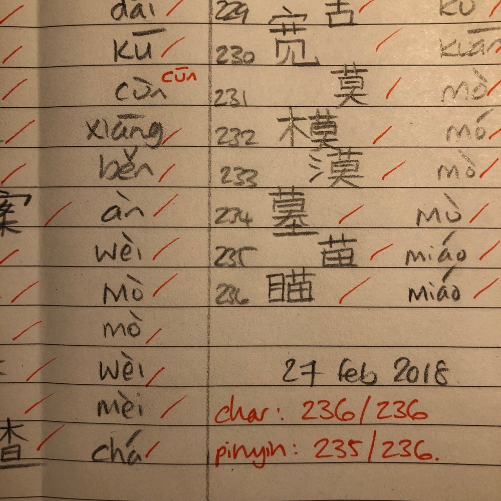 As you can see, today I got all 236 Heisig characters right and just made one mistake in the pinyin, where I used a fourth tone instead of a first tone.