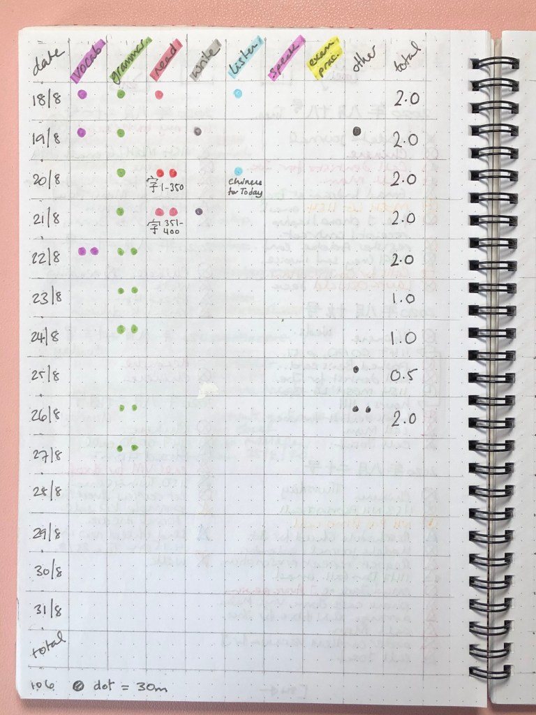 Without further ado, here are three photos from my recent efforts. First, here’s my study tracker. The idea is to make sure that I am spreading my efforts across different types of activities over time. I’m concentrating on grammar right now because I know my vocabulary is good enough for HSK 1 and then some. So I want to make sure that my grammar is rock-solid before I start studying in earnest for HSK 2. One dot in this chart is equal to half an hour.